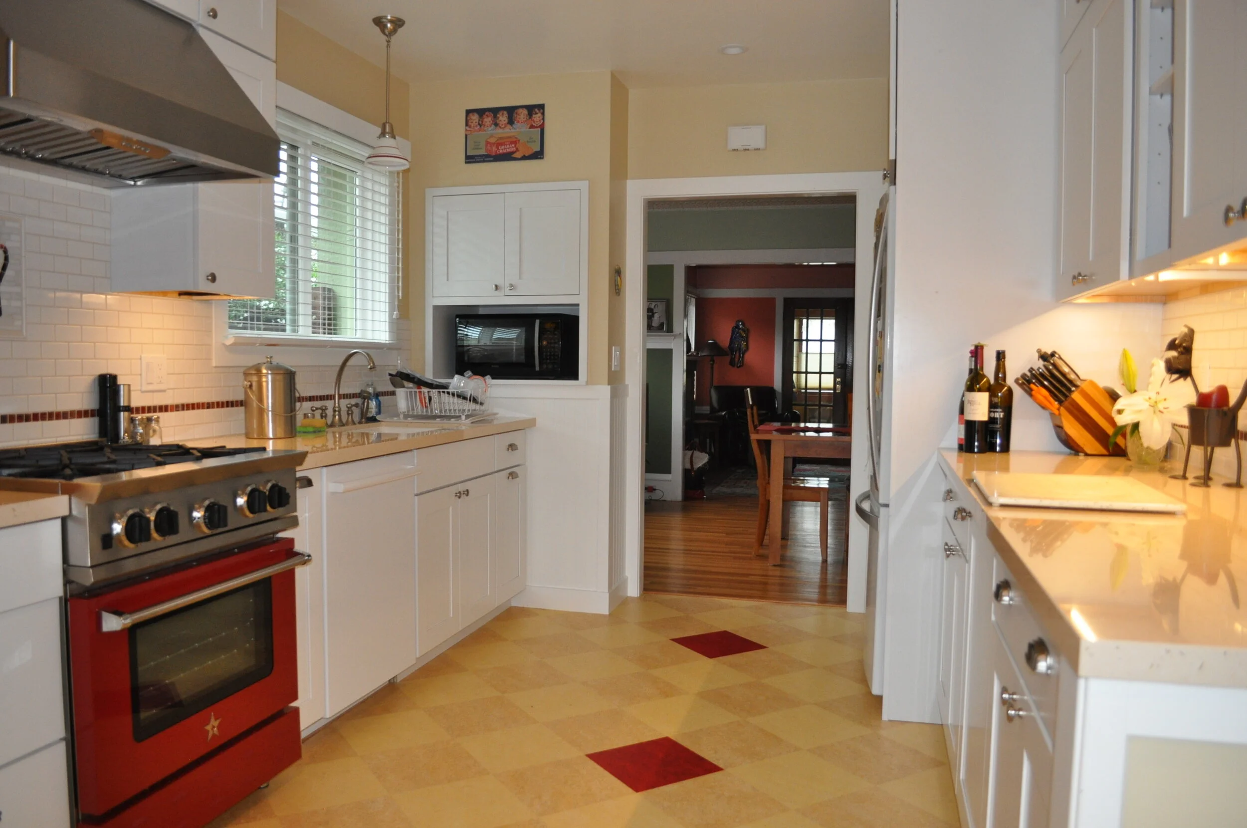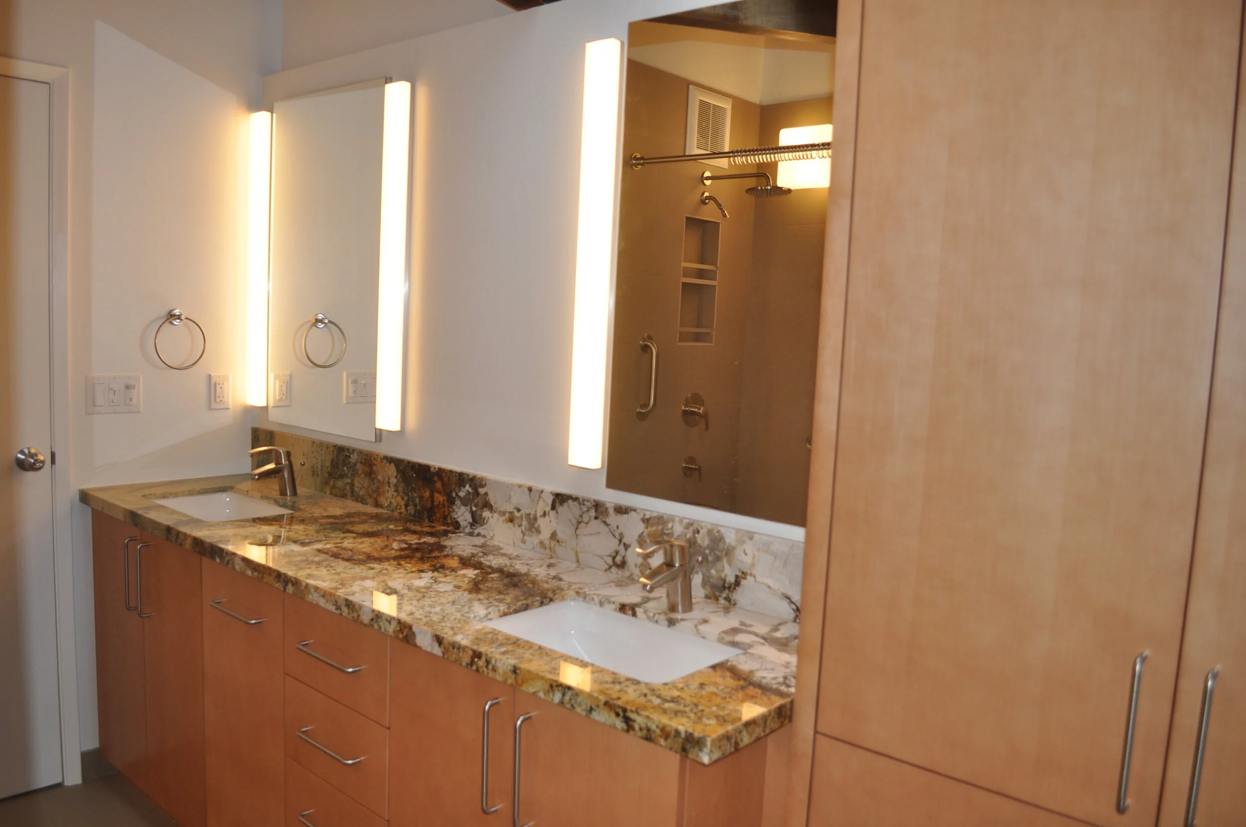 A complete bath remodel in Berkeley: upstairs bath. Black tile at shower pan with black honed solid quartz for curb